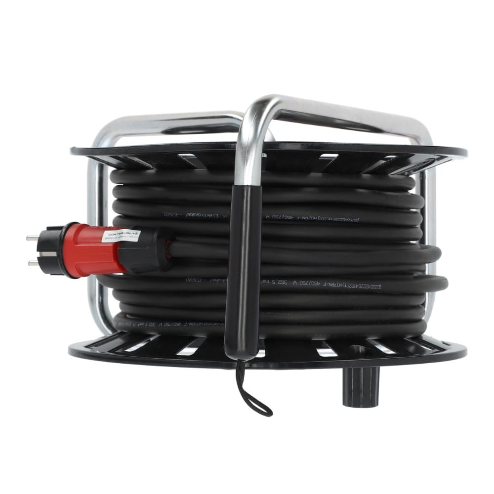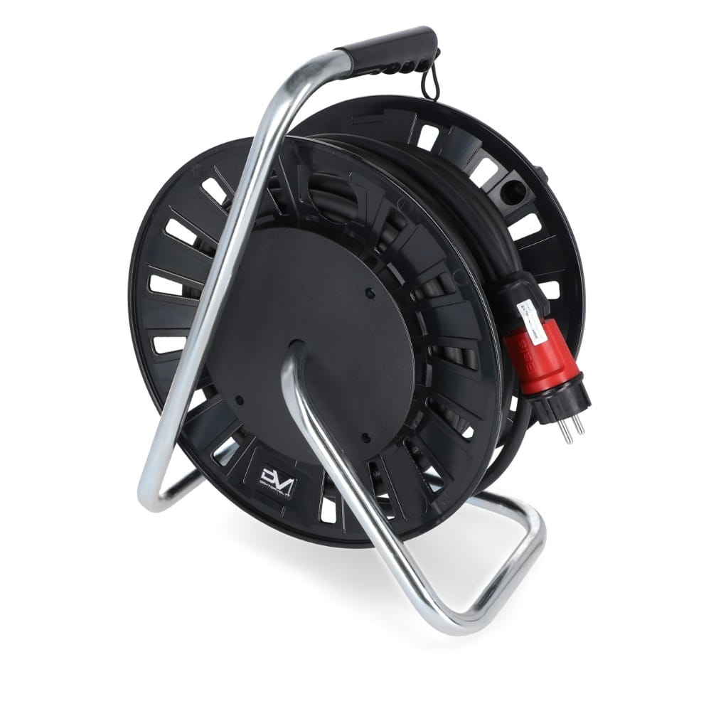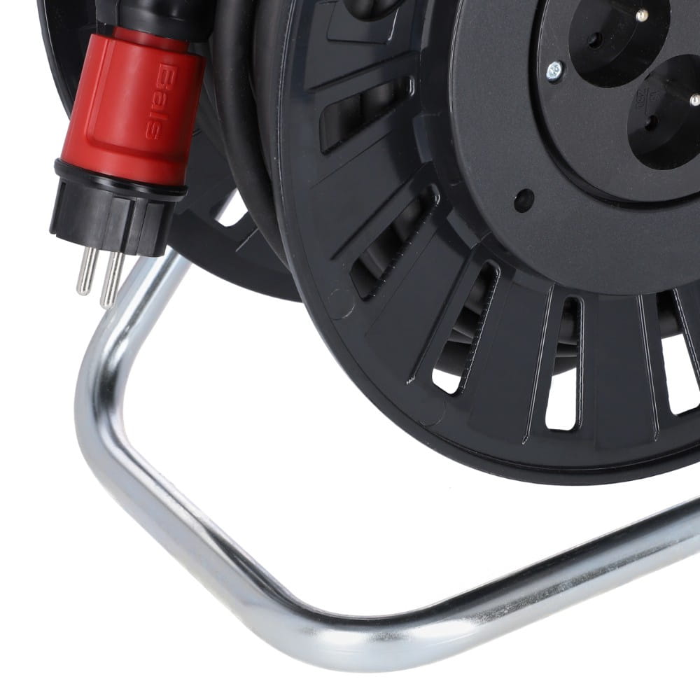 ➡️ Kabel jest wygodny w użytkowaniu, posiada gumowy uchwyt do przenoszenia, obracający się uchwyt do zwijania kabla, blokadę obrotu bębna i wtyczkę zalewaną o stopniu ochrony IP44. Kabel przystosowany do ciężkich warunków użytkowania również na zewnątrz.
