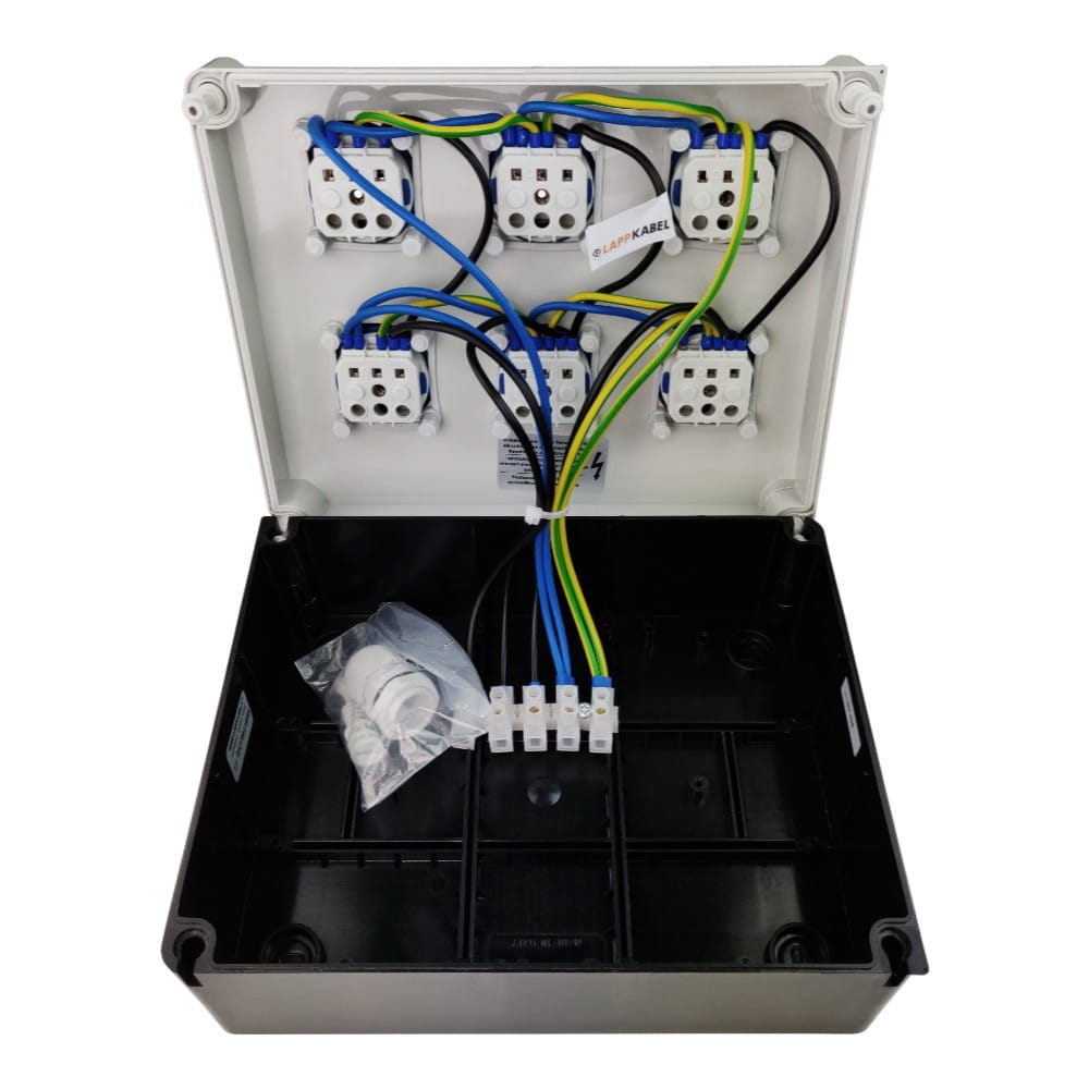 ✔️ sześć gniazd 6x 230 V 16 A o klasie szczelności IP44,