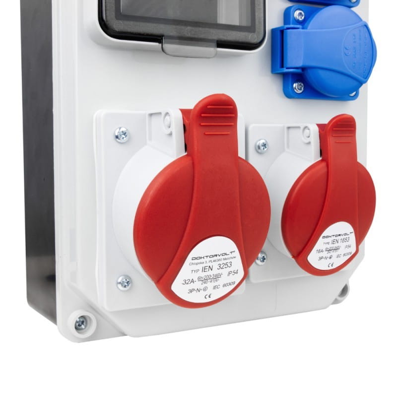 ✔️ wyposażona w dwa gniazda 230V 16A IP54, jedno 400V 32A IP54 oraz 400V 16A IP54,
