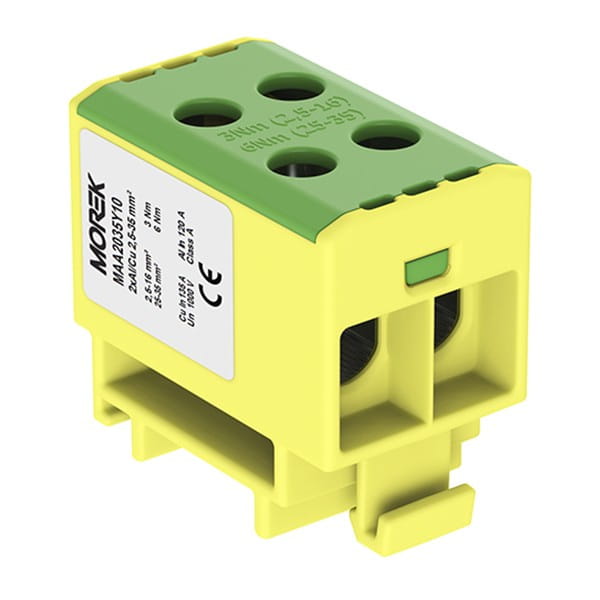 Złączka szynowa 2,5-35mm2 żółto-zielona 4 otwory zaciskowe 1 torowa AL/CU gwintowa 1000V na szynę TH35 1polowa MAA2035Y10 Morek